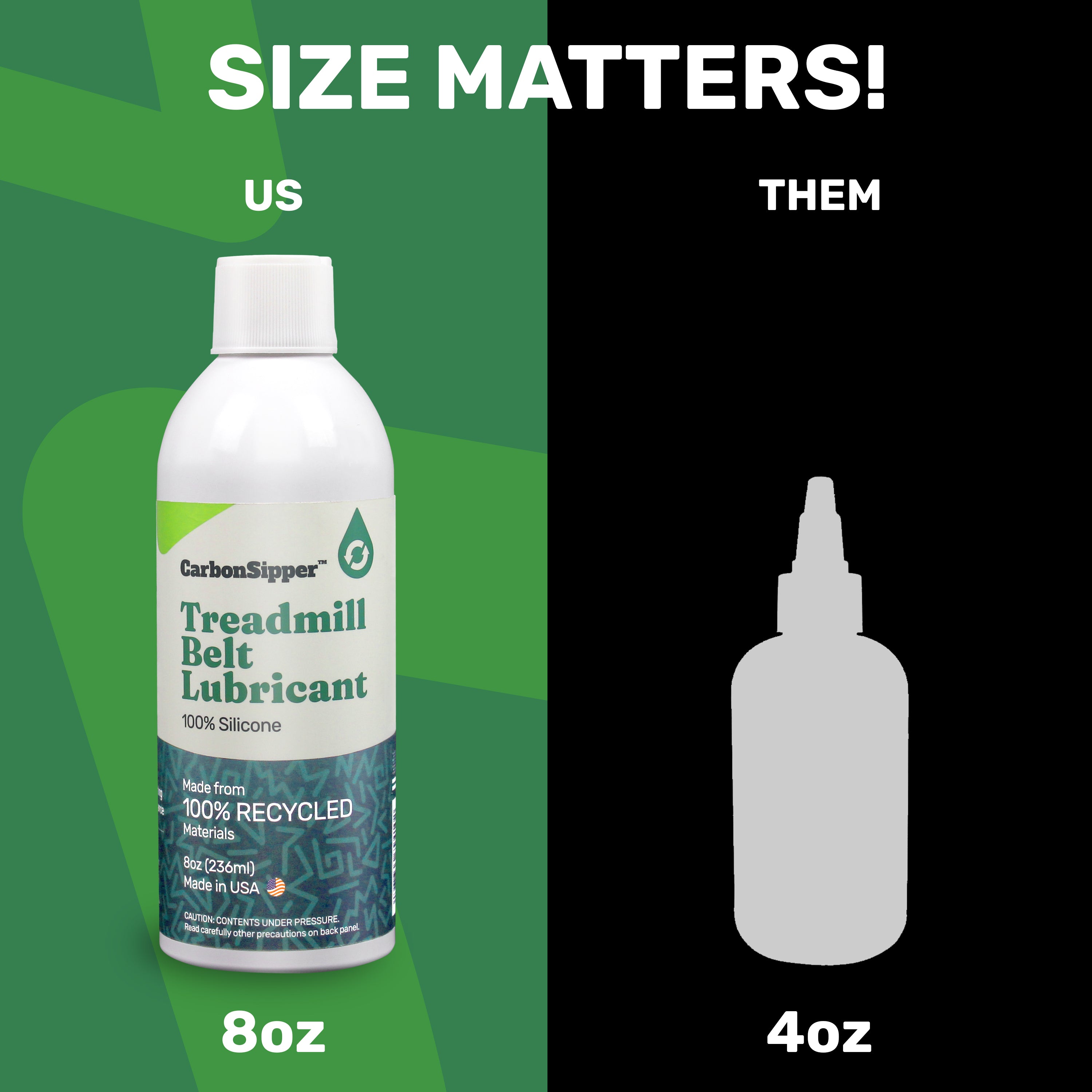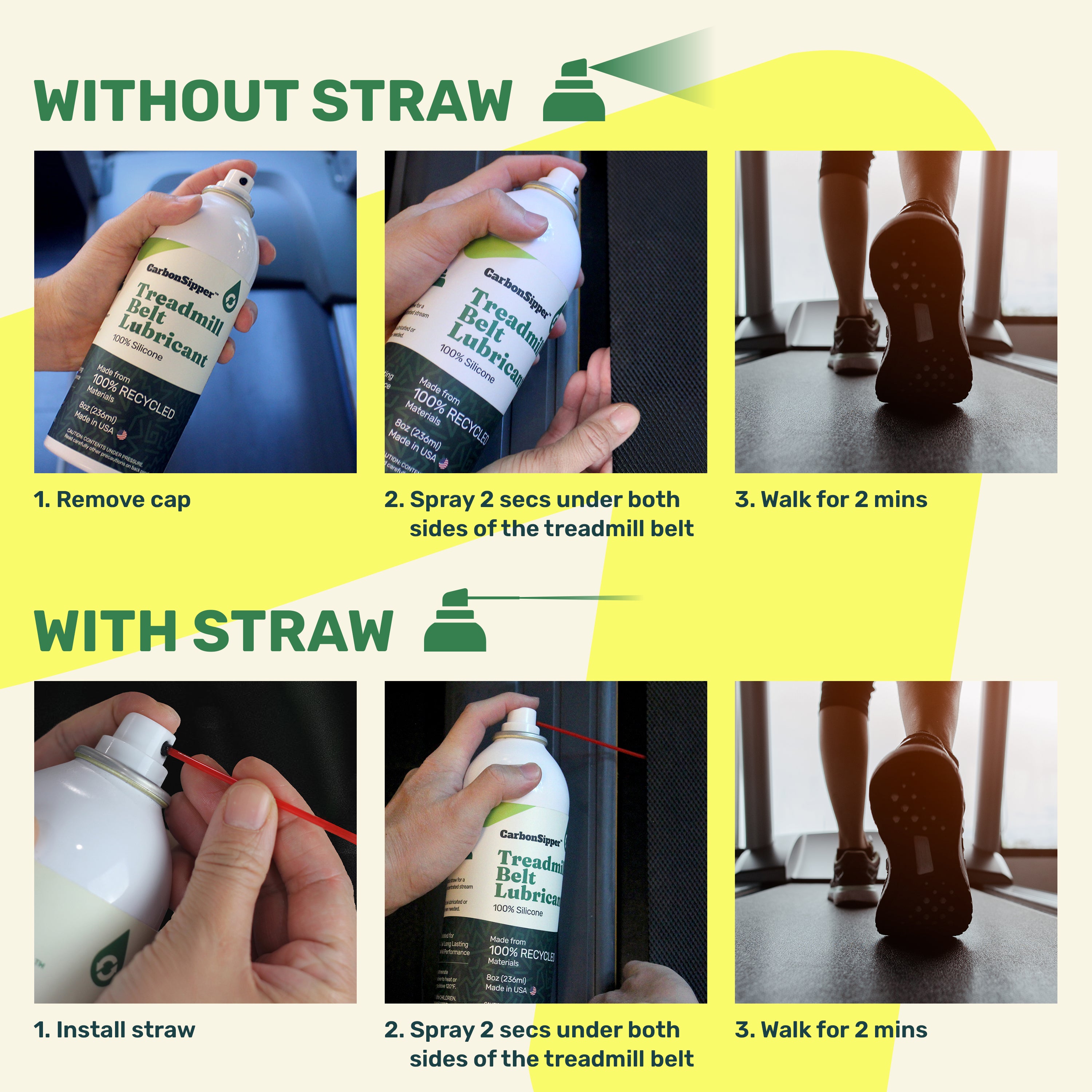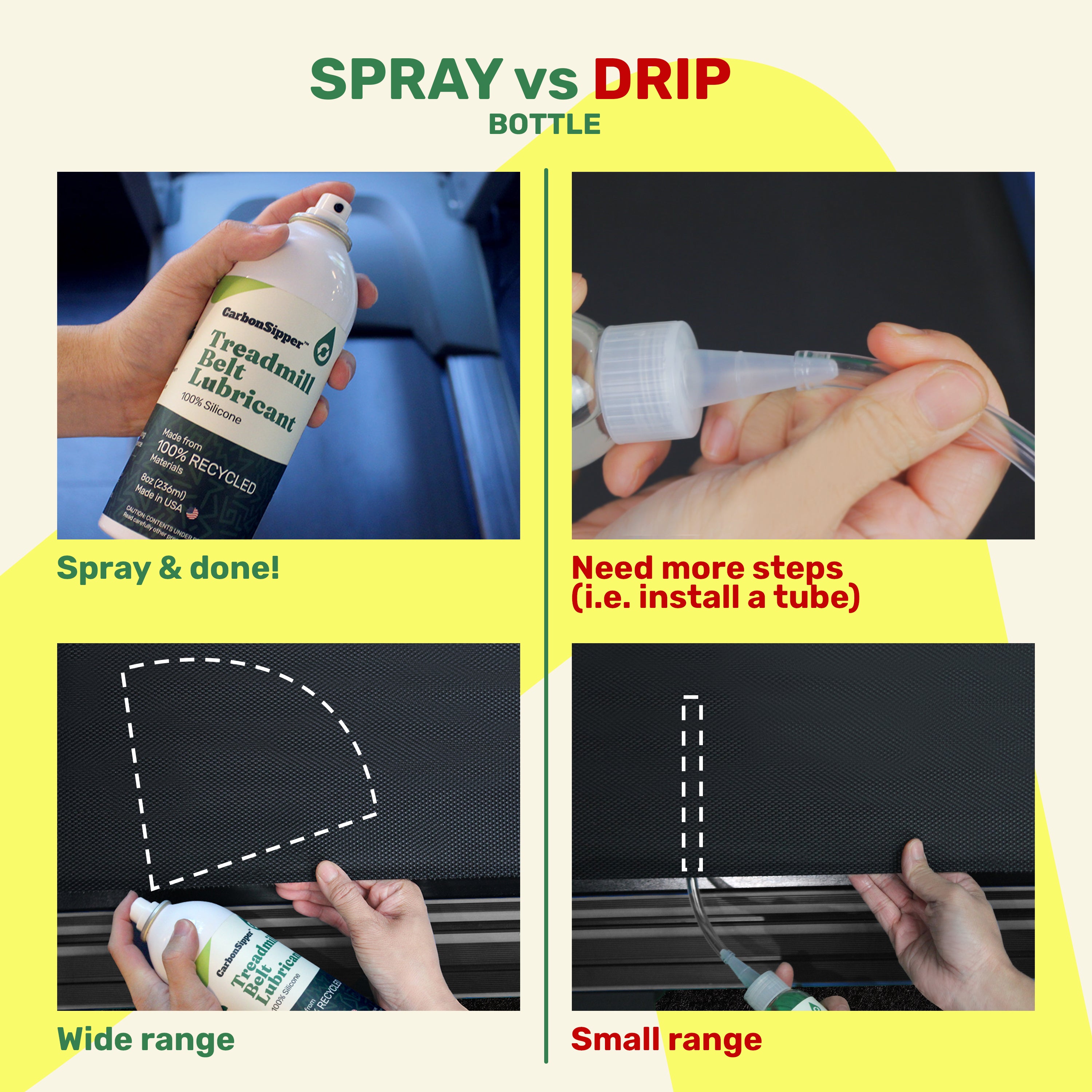 Simply spray a small amount of lubricant beneath the belt of your treadmill. It's easy to apply and doesn't require any special tools or equipment. There's less risk of slipping or spreading excess oil on the floor and treadmill belt surface compared to a drip bottle.